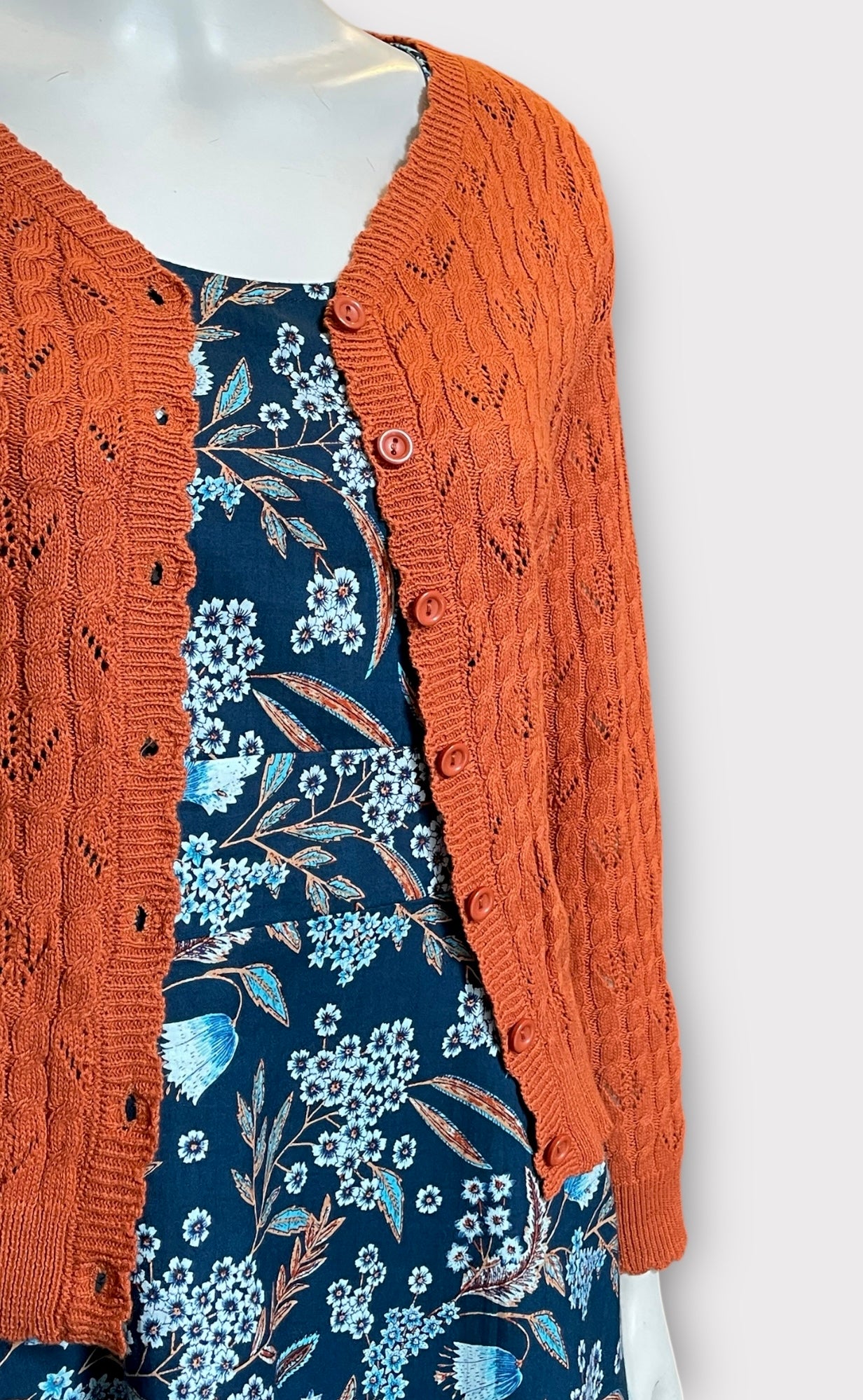 A classic, patterned knit, cotton cardigan. The perfect extra layer as we transition into colder days.