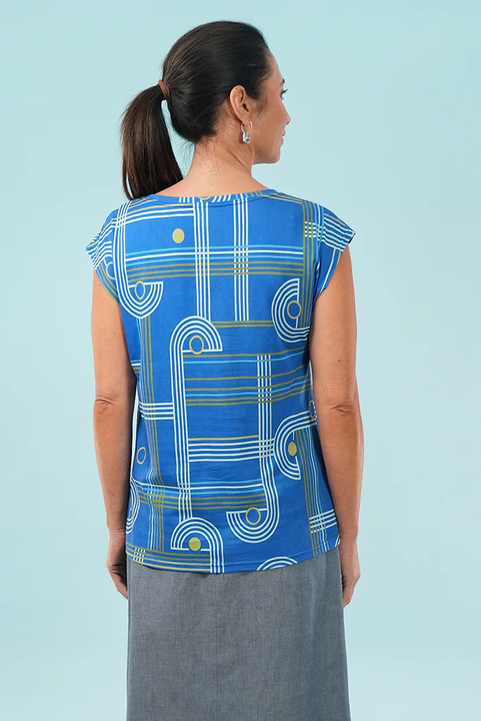 It’s made in a royal blue, 100% cotton knit (stretch) with an original geometric print by Moyra at Essaye, in shades of blue and green.
