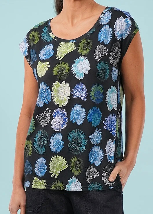 It’s made in an ink coloured, 100% cotton knit (stretch) with an original floral print by Moyra at Essaye, in shades of blue and green.