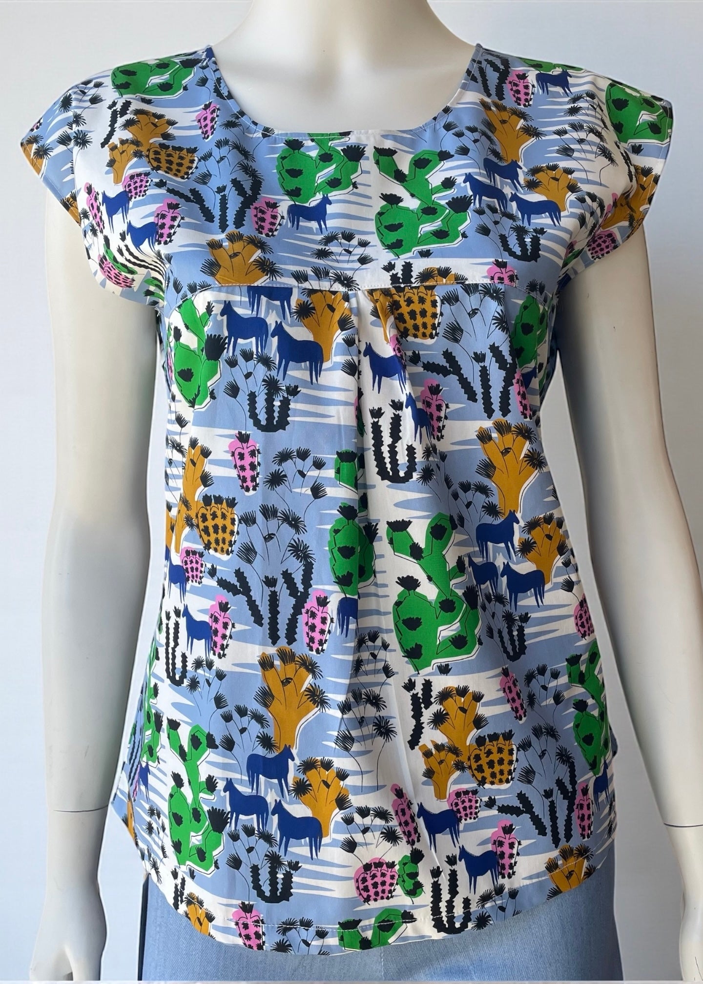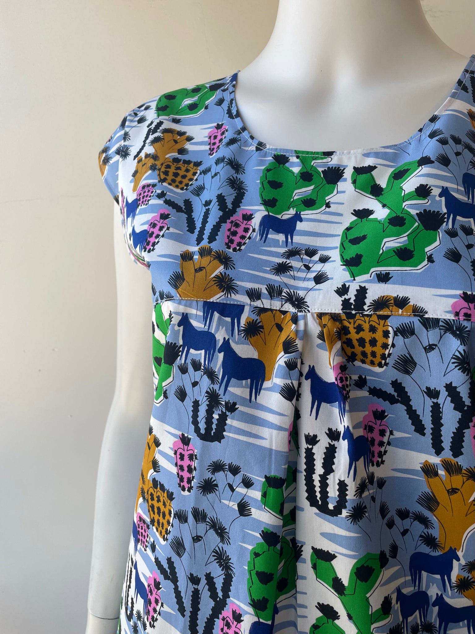 Made up in a medium weight cotton, with the cutest cactus and horse print by Doops Designs, on a light blue and white base.