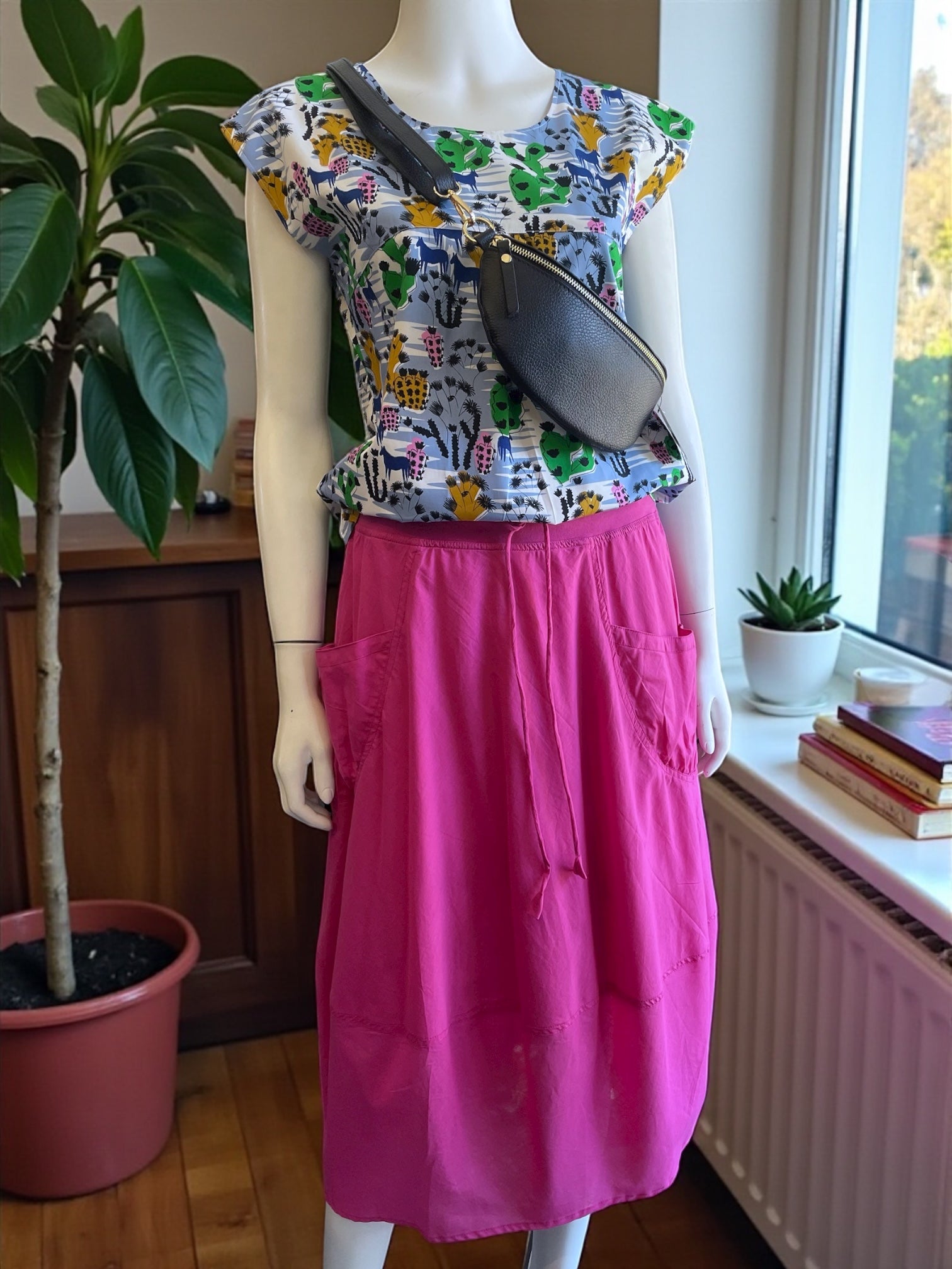 Last image is our geo birds smock top worn by Jay (bust 120cm, hip 130) wearing the XL, just to give you an idea of how it looks on a body.